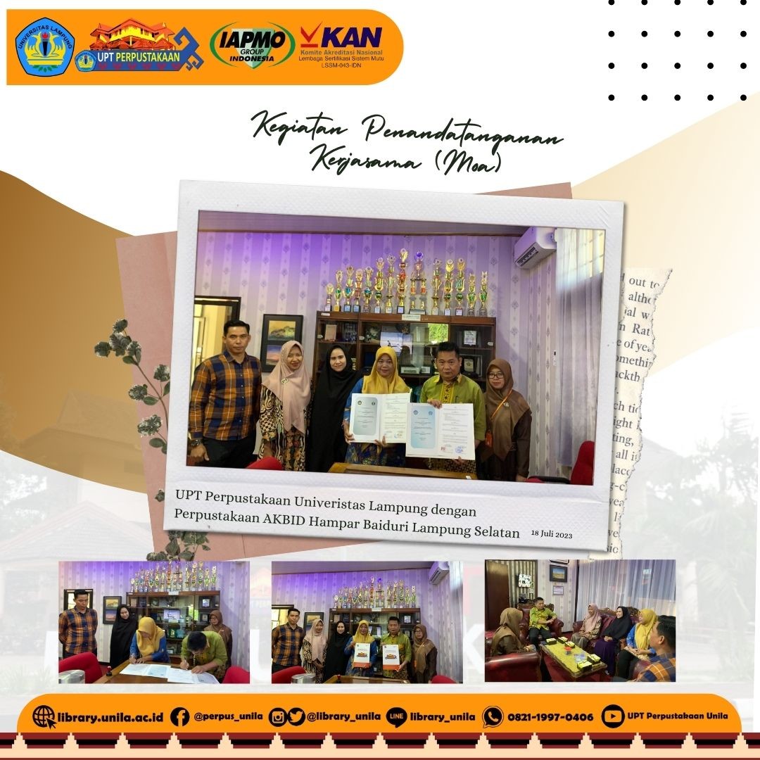 Kegiatan Penandatanganan Kerjasama (Moa) UPT Perpustakaan Universitas Lampung (Bapak Ir. Khairudin, S.T., M.Sc., Ph.D.Eng.) Dengan Perpustakaan AKBID Hampar Baiduri Lampung Selatan (Ibu Etty Anggraeni, A.Md.)